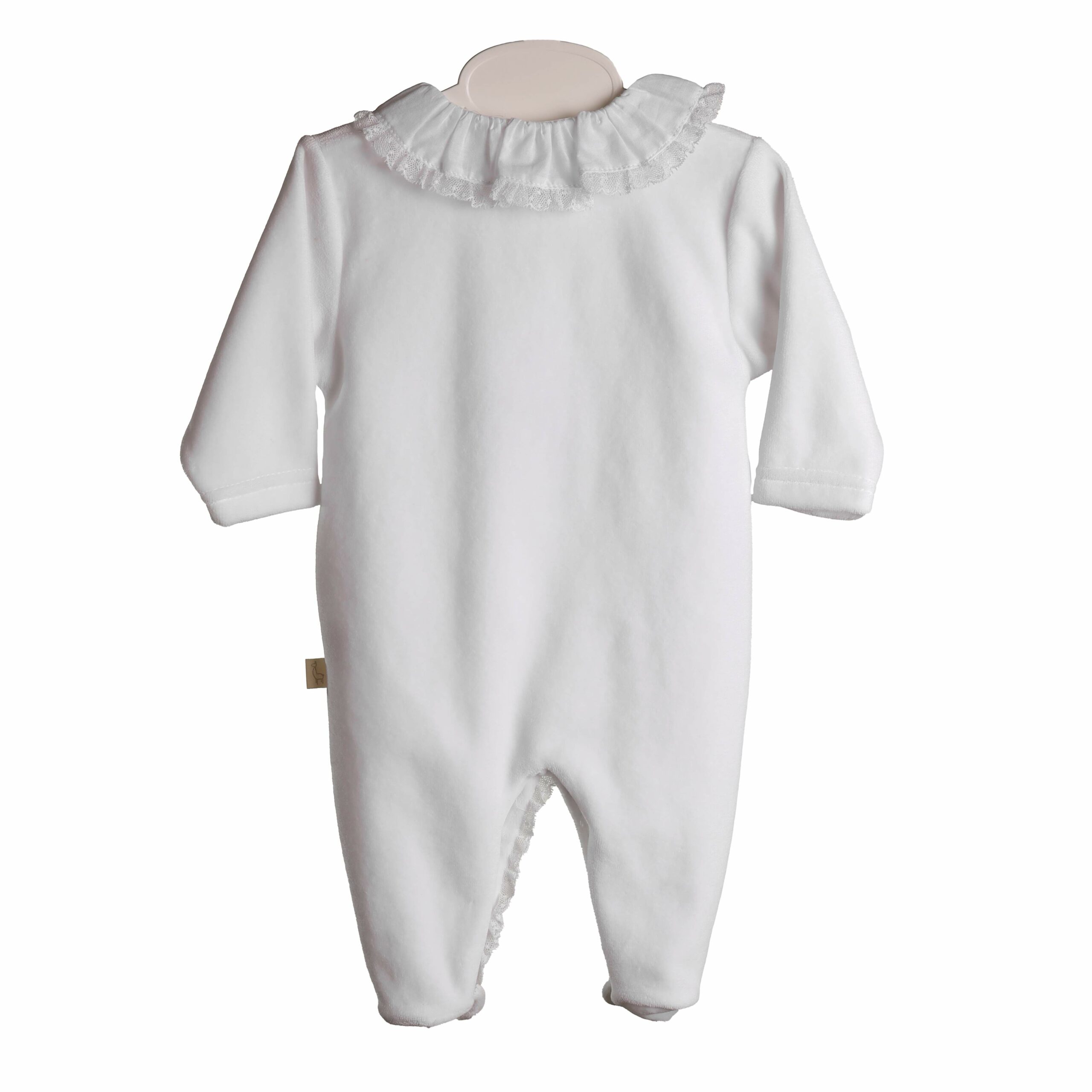 Wit babypakje van Baby Gi is voorzien van een schattig kraagje met ruches, wat een charmant en speels detail toevoegt aan het ontwerp.